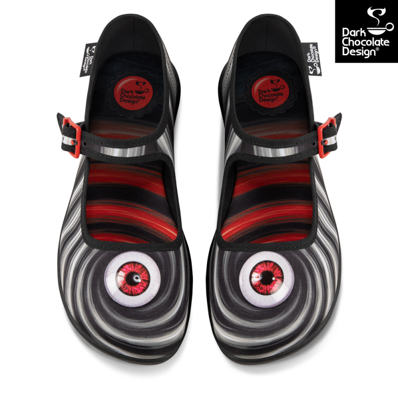 Sort/hvide sko med spiraler og øjne. Skoene er lavet i slidstærkt stof og har sort gummi såler. Skoen lukkes med spænderem over vristen. Remmene er lange, så skoen også kan bruges af dig med høj vrist.