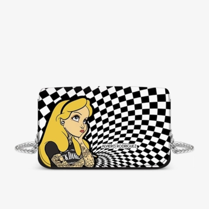 Lille sort taske med Alice i Eventyrland. Tasken kan bruges både som skuldertaske og som clutch. Taske består af et stort indvendigt rum og lukkes med magnetisk knap. Der medfølger aftagelig skulderrem, som er en sølvfarvet metalkæde.