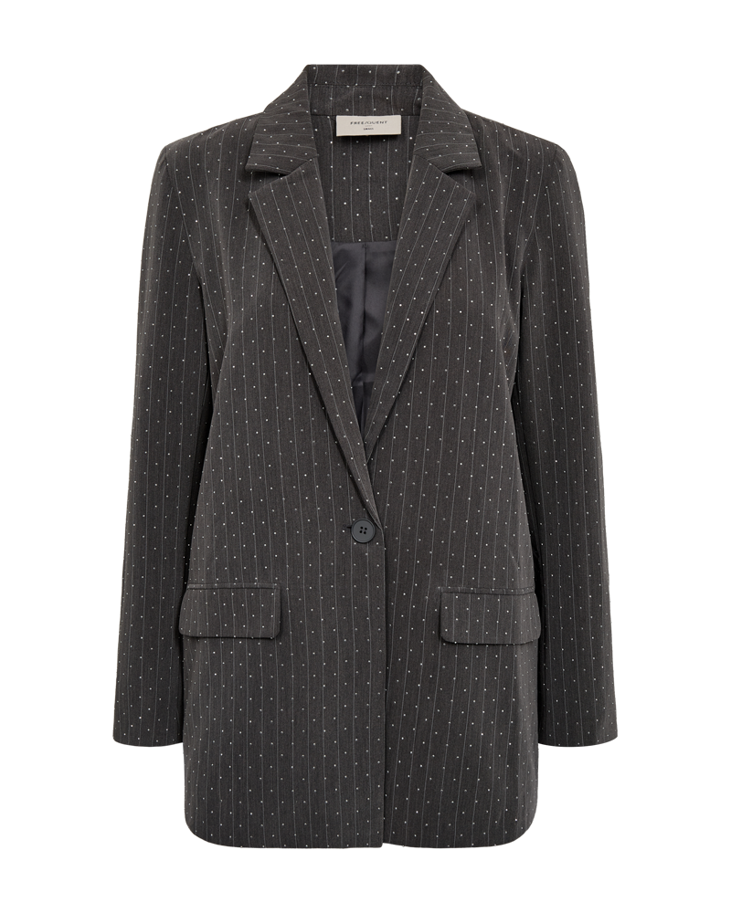 Stilfuld og moderne blazer fra FREEQUENT i mørkegrå melange med klassiske nålestriber og elegante små similisten, der giver et diskret, eksklusivt shine. Den tidløse pasform og enkle knaplukning gør den perfekt til festlige anledninger.
