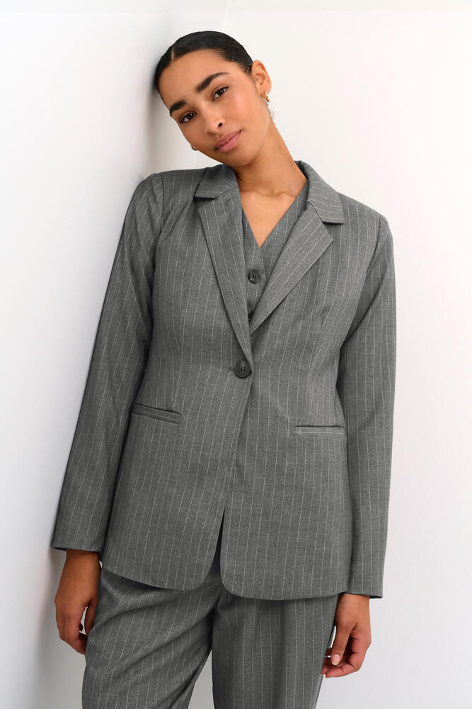 Klassisk nålestribet blazer med bred reverskrave og skulderpuder.