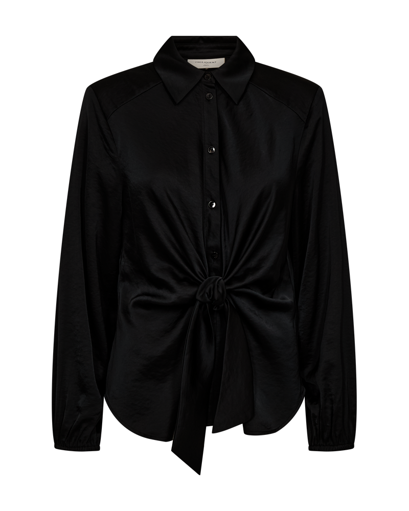 Elegant bluse til kvinder fra FREEQUENT. Blusen har klassisk krave, stolpelukning og lange ballonærmer med elastikkant. Blusen har et silke look, smalle læg på ryggen og stilfuld knude detalje foran, der giver en rigtig flot effekt.