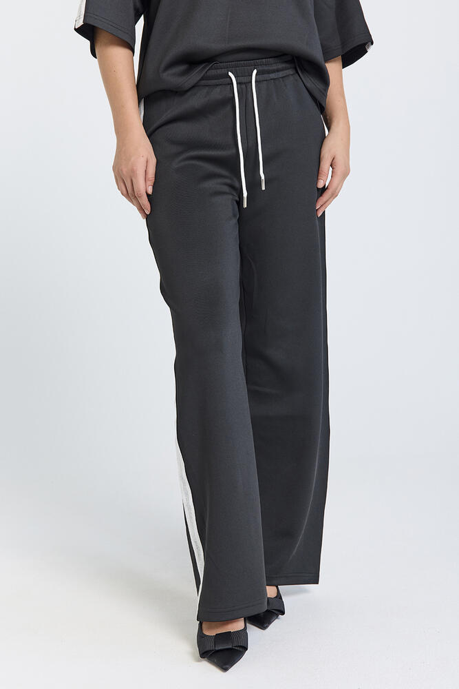 Smarte bukser til kvinder fra FREEQUENT. Bukserne har høj talje med elastik og snøre, og har sporty striber med similisten ned langs siden. Bukserne har lige brede ben og er dejlig bløde og strækbare i kvaliteten.