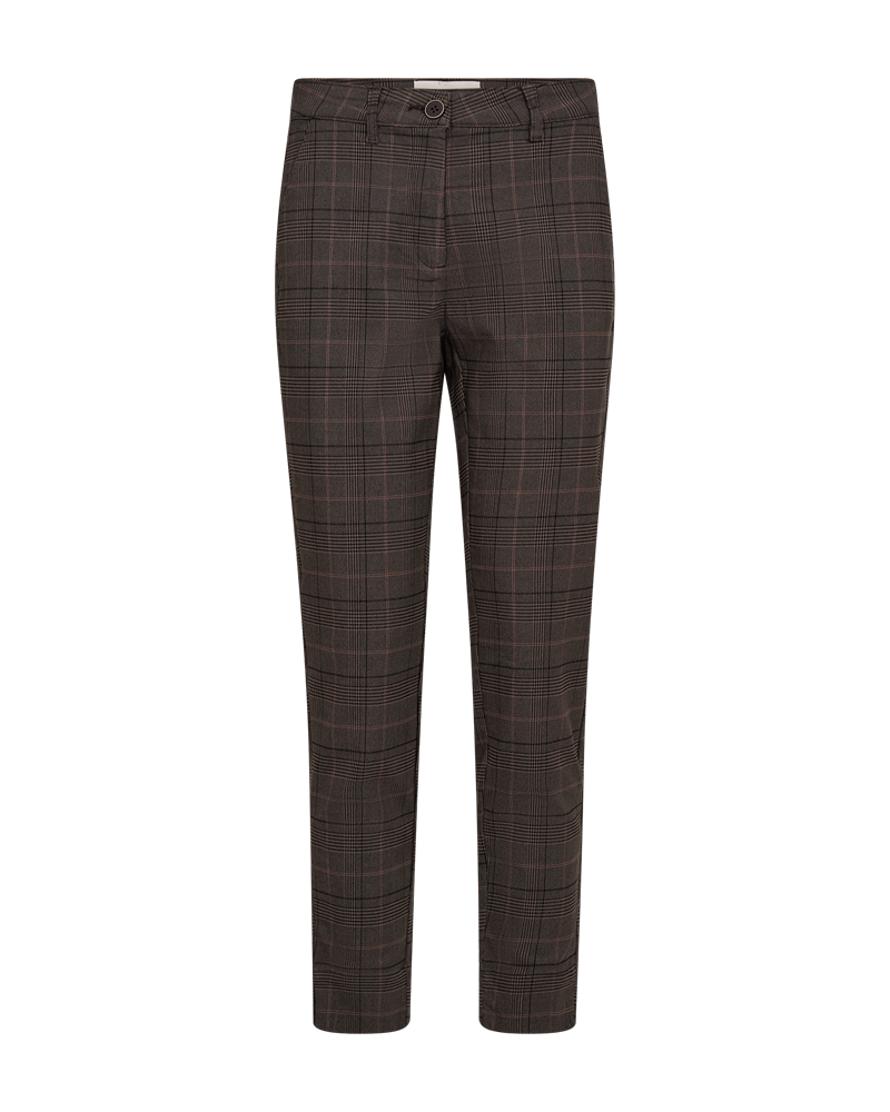 Bukser til kvinder fra FREEQUENT. Klassisk og enkel buks med høj talje, knap- og lynlåslukning, samt skrå sidelommer. Bukserne er dejlig strækbare i stoffet, har et ternet mønster, er smal i pasformen og har ankel længde.