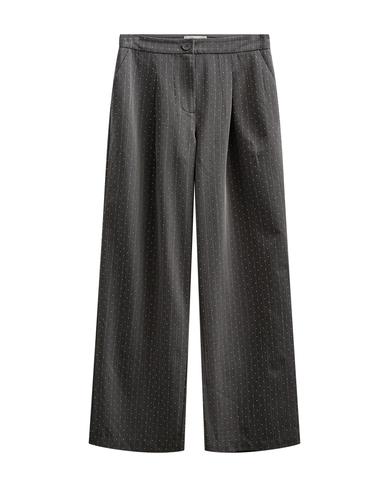 Elegante bukser fra FREEQUENT i mørkegrå melange med klassiske nålestriber og små similisten, der giver et diskret og eksklusivt look. Den lige pasform og komfortable talje gør dem perfekte til festlige anledninger.
