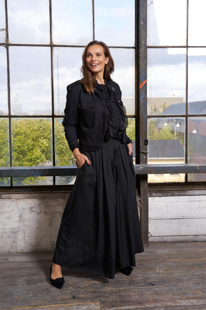 Skønne bukser til kvinder fra Marta du Château. Bukserne har bred elastik i linningen bagpå, bæltestropper, og lommer i sidesømmen. Bukserne har læg foran og meget vidde i benene, hvilket giver et nederdele look.