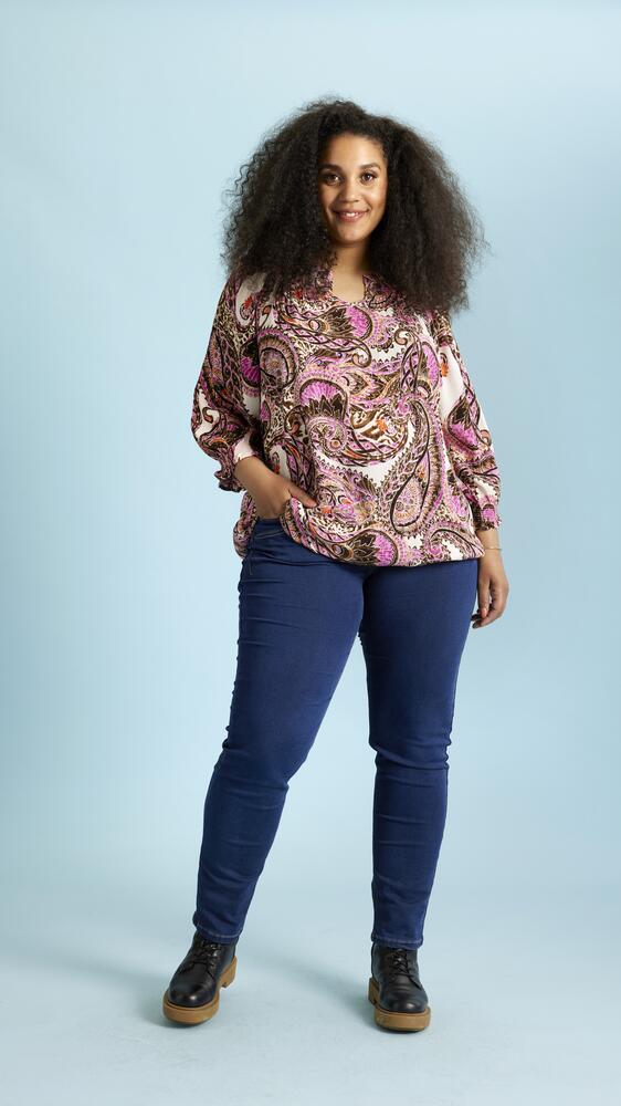 Lækker buks i meget strækbart materiale, med justerbar talje og 5 lommer.
