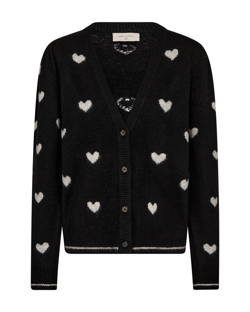 Skøn strikket cardigan til kvinder fra FREEQUENT. Cardiganen har V-udskæring, er gennemknappet og har lange pufærmer. Cardiganen har det sødeste hjerte mønster, samt alle kanter er ribstrikkede med en kontraststribe.
