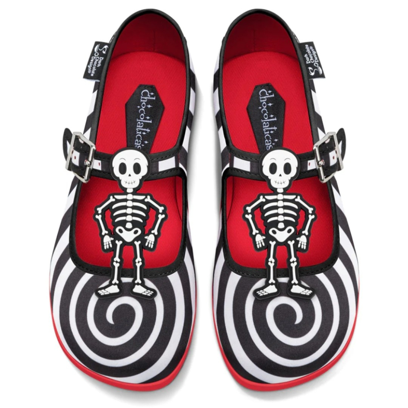 Flade sko med en sort/hvide spiral. På spænderemmen sidder der et skellet, som er lavet i blød gummi. Skelletterne kan tages af. Skoene har fleksible røde gummi såler og lukkes med spænde remme.