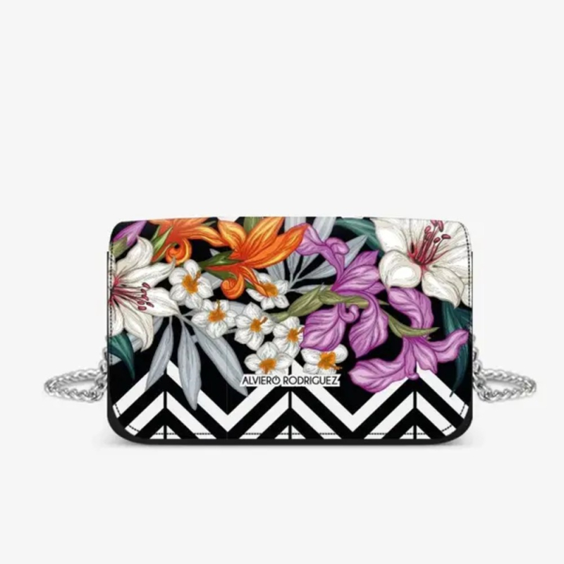 Lille sort taske med blomster. Tasken kan bruges både som skuldertaske og som clutch. Taske består af et stort indvendigt rum og lukkes med magnetisk knap. Der medfølger aftagelig skulderrem, som er en sølvfarvet metalkæde. Mål: 22 x 14 x 4 cm.