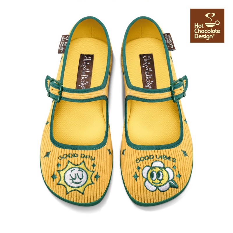 Flade sko i gult jernbanefløjl med mørkegrønne detaljer. På den ene sko er en broderet sol med teksten Good Day. På den anden sko er en broderet blomst med teksten Good Vibes. På siderne er små grønne stjerner brodret på.
