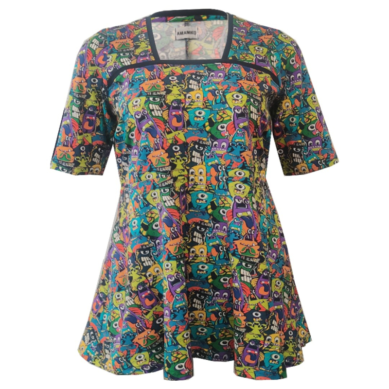Keiko er en peplum bluse med firkantet udskæring. Blusen har overskæring under barmen, så den understreger det smalle stykke og kammuflere maven med den løse underdel.