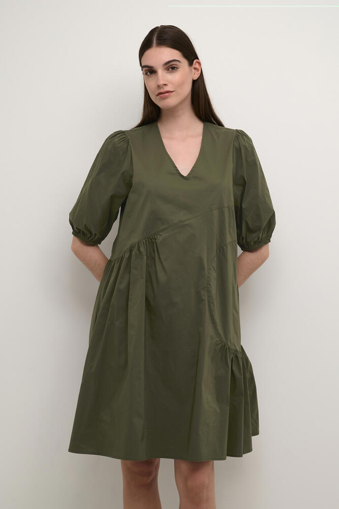 Kjolen har V-udskæring og halvlange pufærmer med elastikkant.