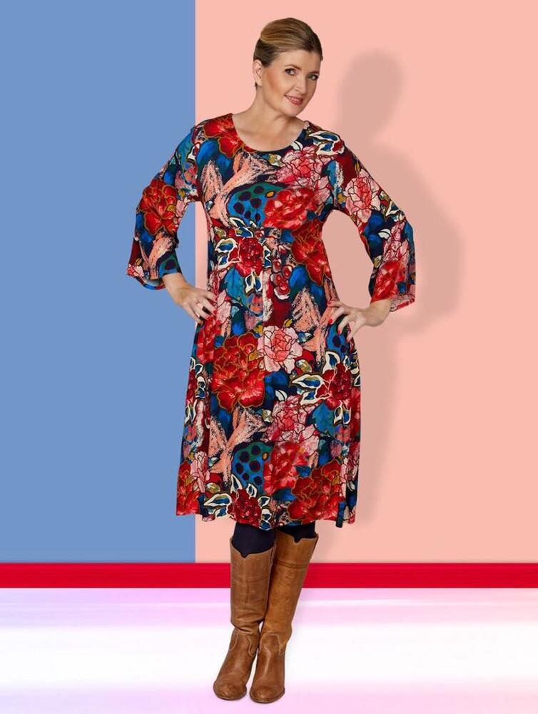 Kjolen har rund hals, 3/4 lange ærmer med vidde i enderne og et abstrakt blomstret mønster.