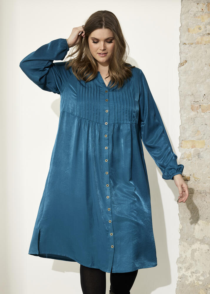 Kjolen har rund hals med V-snit, lange ærmer med elastikkant og er gennemknappet.