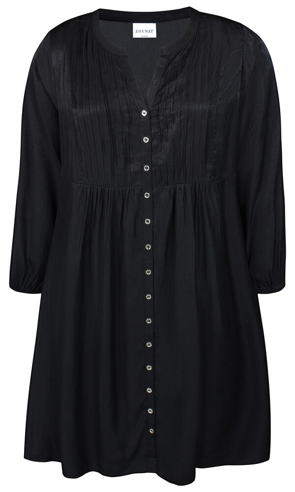 Kjolen har rund hals med V-snit, lange ærmer med elastikkant og er gennemknappet.