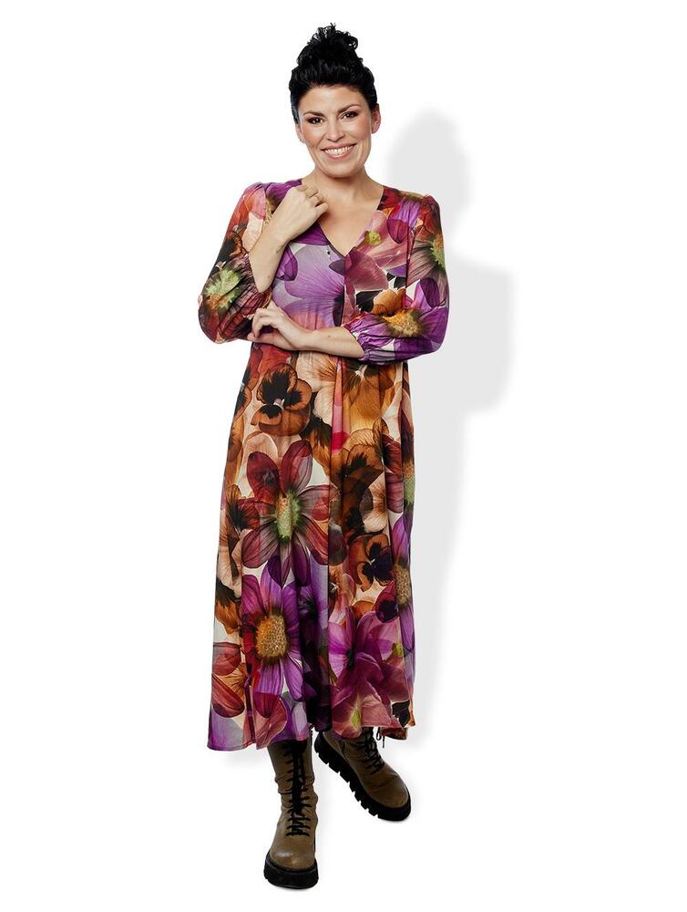 Kjolen har et smukt storblomstret mønster i dybe efterårsfarver og lommer i sidesømmen.