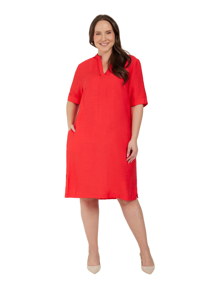 Skøn enkel kjole med V-udskæring, korte ærmer og lommer i sidesømmen.