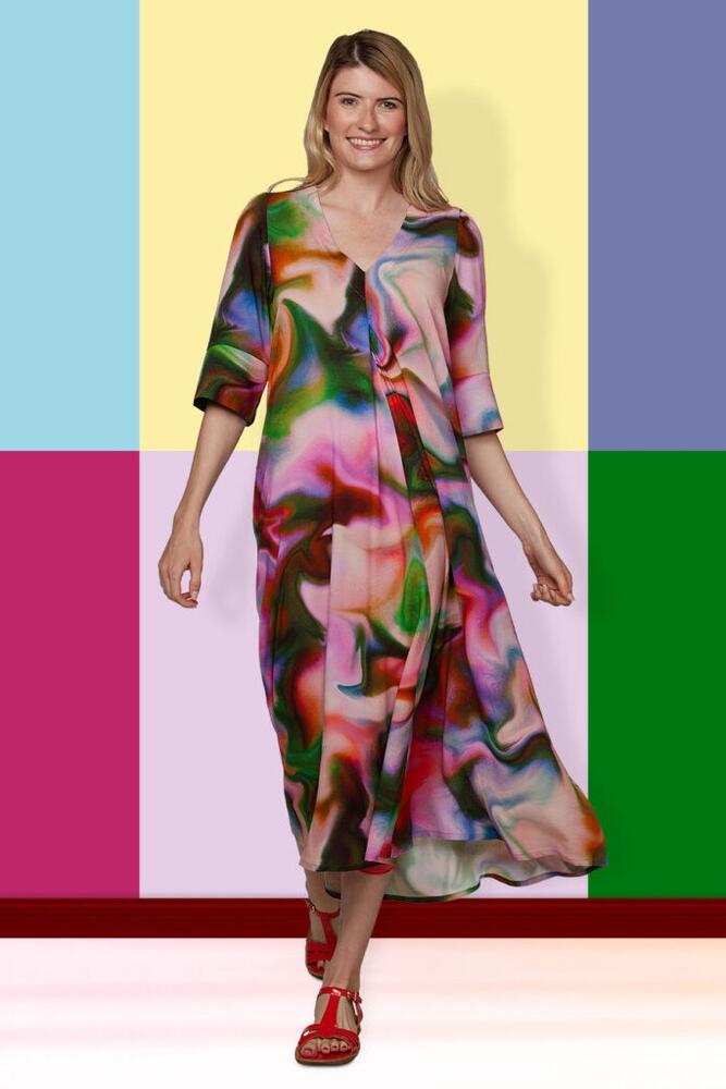 Kjolen har V-udskæring med et enkelt læg, der går ned langs kjolen, halvlange ærmer og lommer.