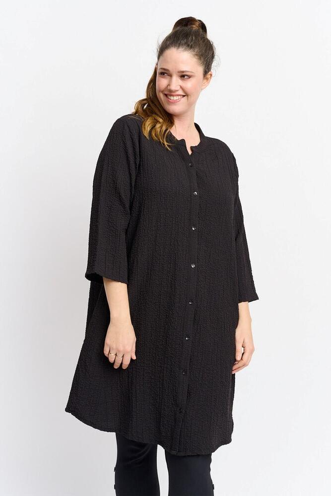 Skjorten har flot v-udskæring, 3/4 lange ærmer, sidelommer og knapper hele vejen ned foran.