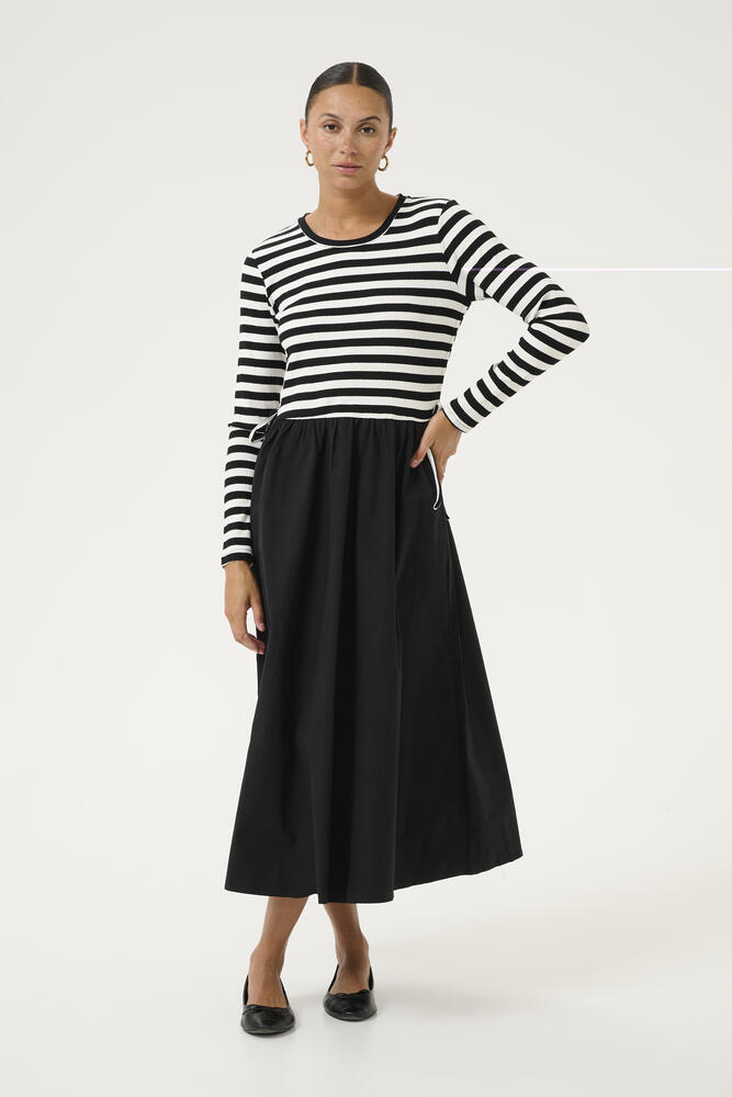 Kjolen har rund hals, lange ærmer og topdelen har striber og ribstruktur.