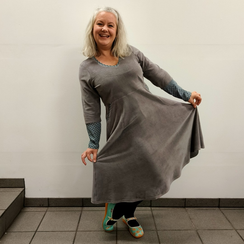 Grå plus size velour kjole med lange ærmer Dana er en kjole med overskæring under barmen og v-udskæring.Kjolen sidder til over barmen og løst skørt der slutter ca. lige under knæet.