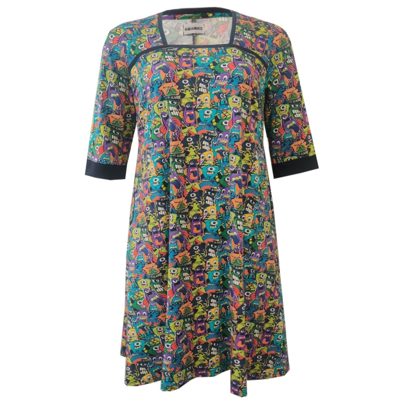 Tokyo er en A-formet kjole med firkantet udskæringKjolen sidder til over barmen og bliver løs om mave og hofter. Her er kjolen syet i multi farvet oeko-tex bomuld jersey med små monstre.Kjolen har dybe lommer kantet med mørk marineblåt bånd.