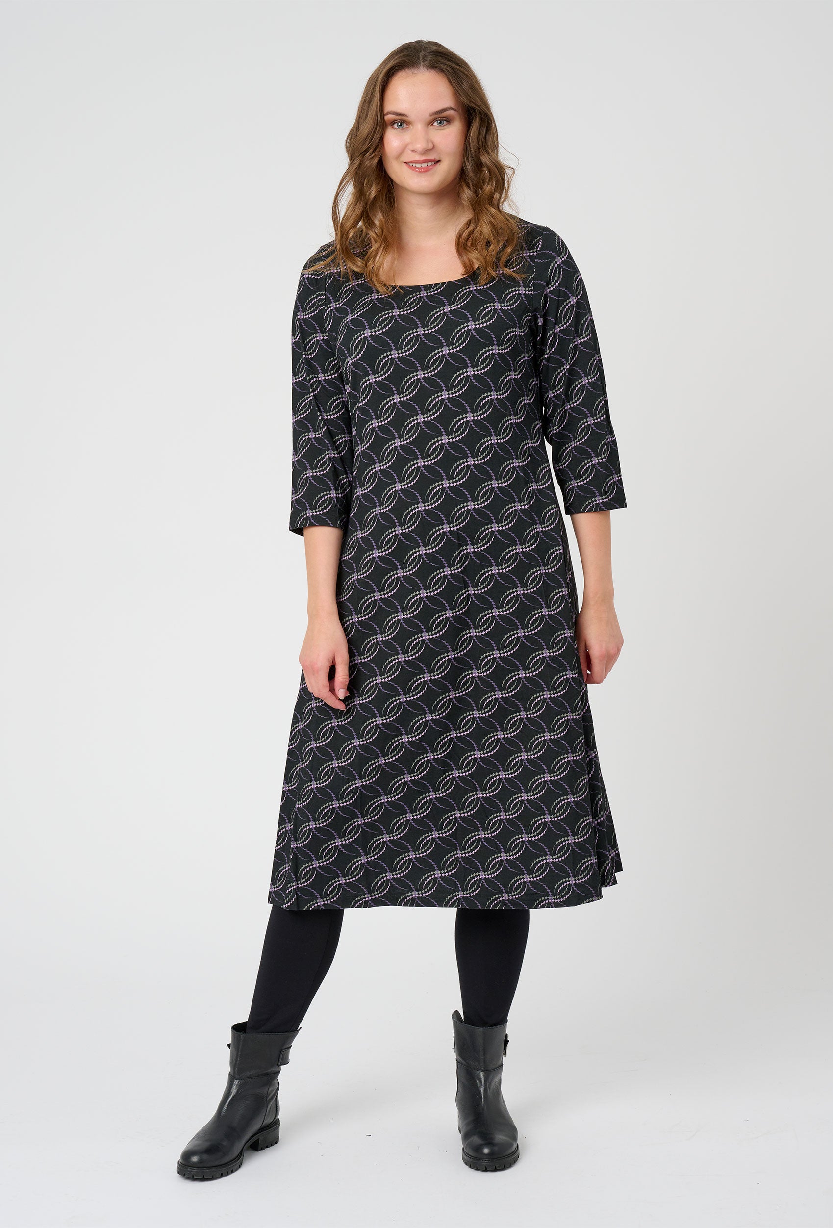 Sød kjole med en blød, firkantet halsudskæring og ¾-lange ærmer. Kjolen har et helt særligt, mønstret design, der pryder hele modellen og giver et super flot spil. Den er udført i den bedste viskosekvalitet med masser af stræk, som understreger den femini