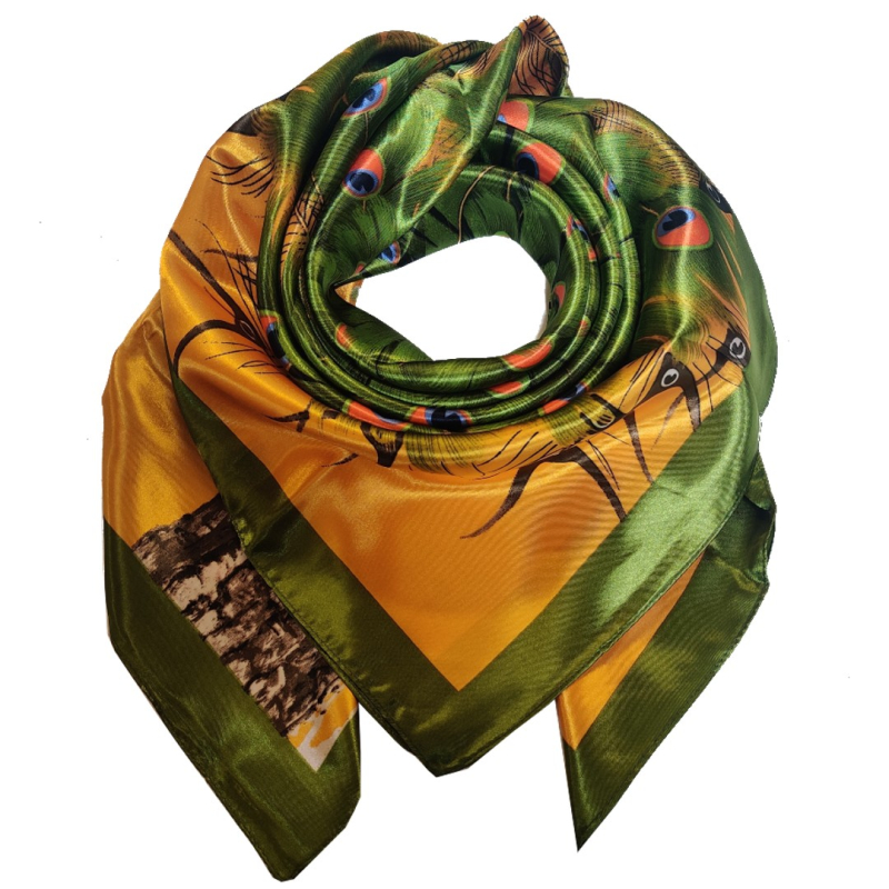Kvadratisk tørklæde med påfugle i gule og grønne nuancer i blank satin. Tørklædet måler 90 cm x 90 cm.