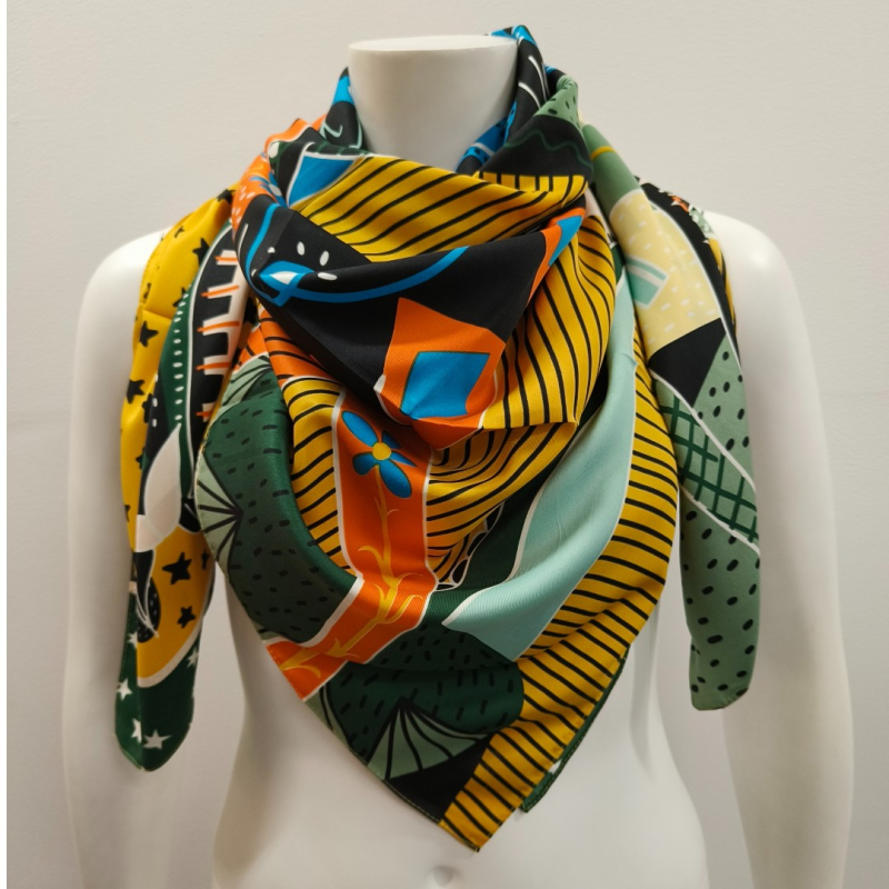 Stort kvadratisk luksus tørklæde i silke. Grafisk motiv med blandt andet heste, stjerner og blomster Tørklædet måler 135 cm x 135 cm. Kan både bruges som tørklæde og som sjal.