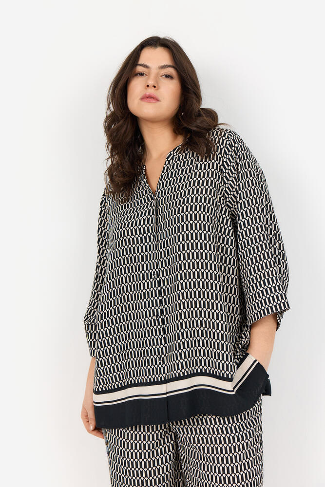 Skjorte i plussize til kvinder fra Wasabi Concept. Skjorten har rund hals med V-snit, 3/4 lange ærmer, et smart geometrisk mønster og diskret knaplukning.