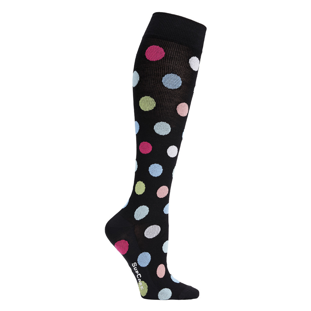 NB Vælg størrelse ud fra din ankel- og lægomkreds for den bedste pasform. Se størrelsesskema under produktbillederne. Giv hverdagen et farverigt løft med disse komfortable støttestrømper fra SupCare i kompressionsklasse 1.