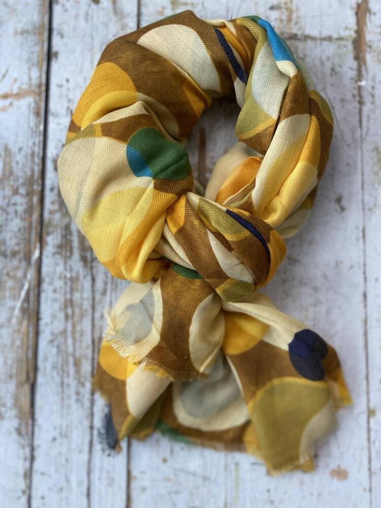 Flot og blødt tørklæde med cirkelmønster på grøn bund fra Vanting.