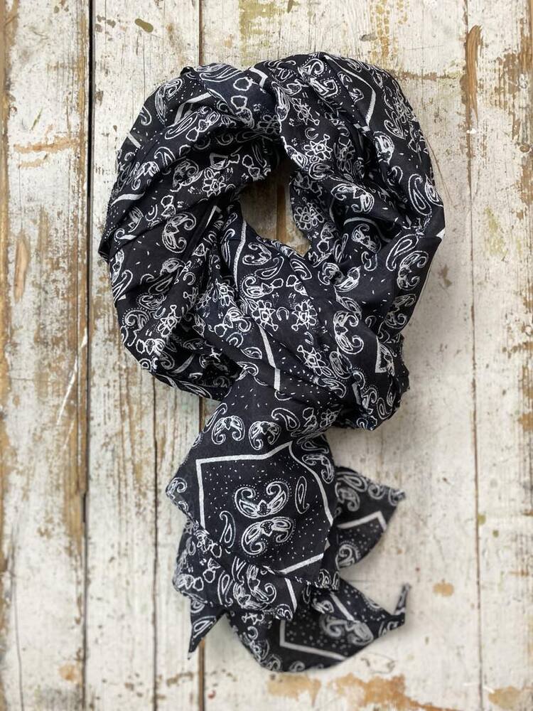 Flot tørklæde med hvidt paisley mønster på sort bund fra Vanting.