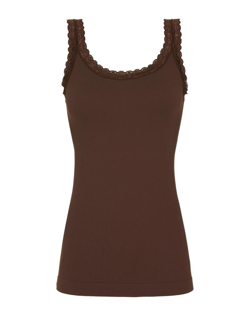 Lækker og komfortabel rib top fra Tim & Simonsen med fine blondedetaljer, der giver et feminint udtryk. Toppen er fremstillet i strækbar mikrofiber, som er både svedtransporterende, åndbar og temperaturregulerende.