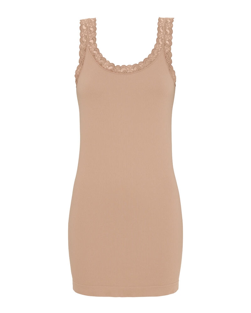 Blød og feminin lang rib top fra Tim & Simonsen i strækbar mikrofiber med smukke blondedetaljer. Toppen er svedtransporterende, åndbar og temperaturregulerende perfekt til både hverdag og som undertop.