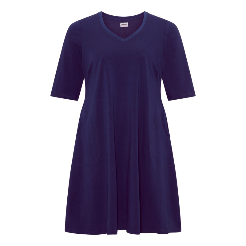Tulla er en A-formet kjole der sidder til over barmen og herefter bliver løsere om mave og hofter. Denne model er syet i lilla øko-tex bomuldsjersey Kjolen har 3/4 ærmer.
