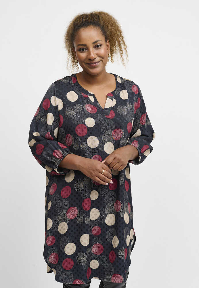 Smuk tunika til kvinder i plussize fra Pont Neuf. Tunikaen har rund hals med V-snit, 3/4 lange ærmer med elastikkant og runder forneden.